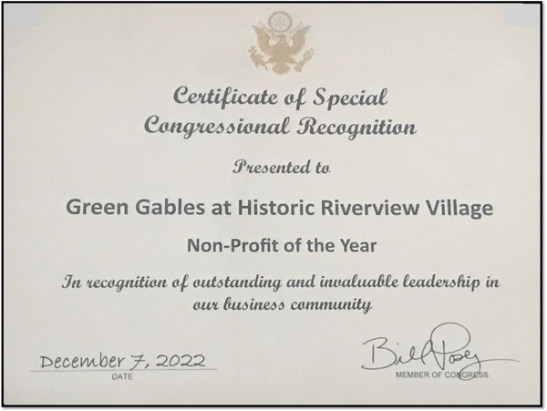 In December of 2002 Congressman, Bill Posey, presented Green Gables with a Certificate of Special Congressional Recognition as the Non-Profit of the Year Award. This was in recognition of outstanding and invaluable leadership in our business community.