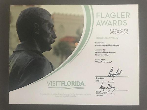 In 2022 several of our Board Members traveled to Miami to receive the Flagler Award. This prestigious award is given by the Visit Florida Visitor & Tourism Services. We were awarded the Bronze award in the Creativity in Public Relations category in recognition of a short film called "Wash Your Hands". This was created by our education program featuring kids encouraging kids to wash their hands during the Covid lockdown.