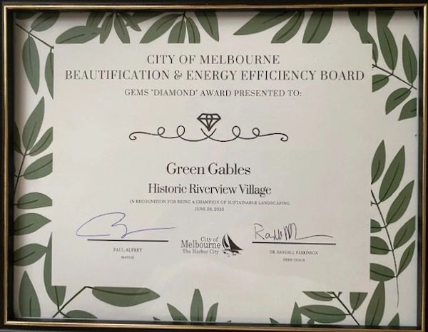 On June 28, 2025, the City of Melbourne's Environmental Community Outreach (ECO) Division, Parks Division, and Beautification and Energy Efficiency Board will present a GEMS Award to Green Gables